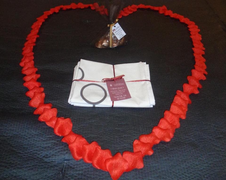La habitación se encontrará finamente decorada con pétalos de rosa. Con tu pareja podrán disfrutar de detalles que complementarán esta ocasión especial: piqueos de jamón y queso, cesta de frutas de temporada, botella de vino espumante y postre de chocolate.